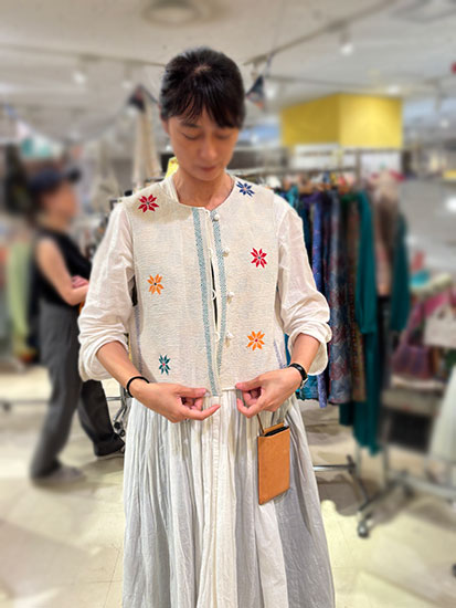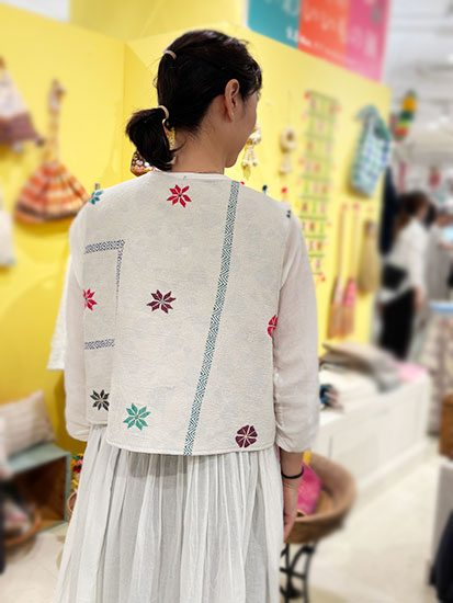 とっておきのベストが出来ました。少しキズのあるノクシカタにハサミを入れて、ベストを仕立てました。脇に布を足したり、後身ごろは別布で、と工夫して完成。一つ一つ表情が違う1点物です。刺し子の素晴らしさ、モチーフのユニークな愛らしさを身に着けて堪能できる逸品。冬はニットに、春はシャツに、夏はTシャツに合わせて、季節をとわずお楽しみくださいね。
