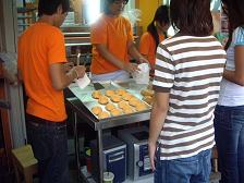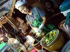 | 2006/7/3 2-2 朝、ムクッと起きてすぐ、ホテルの近くで朝食を求めてウロウロしました・・・。 パン、サンドイッチ、果物、焼きオニギリ、ナドナド。 食べきれないほど買ってしまっても、180円(日本円にしてみました〜) 社長は、胃もたれになっていました。 市場では、僧侶の姿をよく見かけます。 なんだか・・・ホドコシを受けているようなのに、偉そうに感じました。 「まーたコレ!? もっと肉とか無いの!?」 と、通訳してみました。(ごめんなさい (^_^;)) 9時過ぎにタクシーを飛ばして、Various shop の工房ヘ・・・。 と、思ったら、なぜかユイの自宅へ招かれていました。 自宅の敷地内に、別宅を建てていたのが完成したのです。 何から何までを、メイのお兄さんである、ユイのご主人と、ユイの二人で 考えて、(建築と内装)したそうです。 グリーンを基調にした、壁やカーテン、キッチン。 トイレもシャワーも、洗面も、とってもオシャレ〜でした。 美味しいランチをご馳走になって、ユイの赤ちゃんと遊んで、アクセサリーやバッグなど 沢山オーダーしました。 打ち合わせが終わると、チャイナタウンへ向かうことにしました。 メイが次の打ち合わせに向かうから・・・と、車に乗せていってくれました。 毎回行く店なので、勝手知ったる。です。 いつもの日本語の上手な店員を見つけてホッと一安心。 お薦めの、蒸し海老料理や、シャコのす揚げにんにく生姜ソース。 カニチャーハンを食べて、満腹で苦しくなりました。 それでも、デザートを食べようという食い意地のはった私たち。 (^^ゞ 日本語の上手な店員さんも、日本語で説明ができない!というデザートを頼みました。 黄色イ丸イモノデス。甘イデス。 黄色・・・?栗かなぁ? エーート、ニホンゴデ何? ま、いいや!それください。 これがお薦めとは! 二度と聞くものか! お勘定を済ませて外に出ると、日本語の上手い店員さんと、男性がいまして 「アリガトゴザイマシタ!コレ、社長デス」と、日本語の上手い店員さんが、 もう一人の男性を紹介してくれました。 「あ〜どうもどうも、美味しかったです〜!・・・あ!(^_^;)」 つい、つられて日本語で言ってしまいました。 ホテル付近まで戻り、いつものパラダイスに駆け込む二人組みですぅ〜。 あぁ〜 シアワセェ〜。 (#^.^#) |