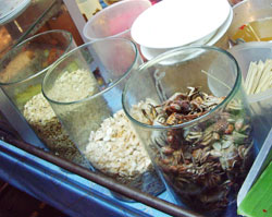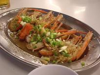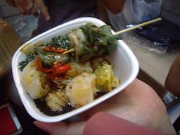 | 2006/7/5 2-2 昨日と同じランチにしようと、ヌードル屋に行きました。 オーダーしたのは、またまたカオソイ・チキンです。 グリーンカレーペーストに、揚げた麺が入っていまして、「つけ麺」ぽいものです。 ヌードル屋の近所にある焼き鳥屋台で、鶏もも肉ハーフサイズ(45円)を買ってもらいました〜。 (^・^)ワン! ハーフサイズ・・・といえども、これがどうして!デカイです。 足一本だと、どんなになるんだろう。。。と、鶏好きは、気になるところです。 その足で、シルク屋さんに行き、何着かオーダーしました。 終わると、すぐ隣のカフェで、お茶にしました。 アイスぞえの、アップルパイがオヤツです。 社長は、スイカシェイクを飲んでいました。 その後は、前から行きたかったマッサージ屋に行きました。 足と腕、肩を1時間半、値段は、1000円くらいです。 同時に日本人の中年男性二人連れが、オイルマッサージを受けていました。 オーナーは、白人男性でした。 見た感じ、60〜70歳、ヨーロッパ人のように見えます。 マッサージを始める前に、お祈りのような仕草をしていました。 この店は、他店とは違うようです。 上手くいえないのですが、東洋医学のツボや、リンパを刺激しているような? 昨日のヒドイマッサージと比べて、良かったですが、バンコックの『パラダイス』が、なつかひぃ〜。 明日は、オイルマッサージをやってもらおうね♪ と、社長と約束をして、夕食には、またエビ屋へ行きました。 ランチもディナー(!?)も同じものばかり食べている感じですが。一向に飽きません。 デザートにマンゴーを食べたのですが、イマイチでした。 そのせいで、ちょっと不機嫌な社長です。。。 (`ヘ´) 楽しみにしてたのにっ (~_~;) まぁまぁ。。。 |