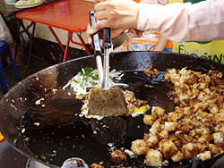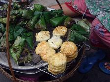 | 2006/2/21(tue.) 2-2 かわりばえしないナイトバザールをウロウロして、裏通りの屋台を見つけました。 まだ食べるの? 何かが焼ける香ばしくて、美味しい匂いがします。 しばらく見ていますと、常に人が並ぶ屋台がありました。 何かを焼きながら、ソムタムを作っている屋台でした。 列が終わった頃にソムタムをオーダーしました。 焼いていたものは、もち米のおにぎりでしたが、丁度売り切れとのこと。 え?これは?と、今焼いているのを指差すと。 これはあの人の分よ と、二つ隣の屋台の子を指差して、苦笑されました。 エヘヘヘ (^^ゞ 辛くしないでね、これ(カニ)は入れないでね。と言って待ちました。 作っているのを横からジィーーーっと見ていますと・・・・ 青パパイヤをピューラーでカットして、干し海老、調味料類をソムタム用の素焼きのクロックに ポイポイっと放り込んで、棒でつぶしました。 あっ!プリッキーファ(唐辛子)を5ー6本入れたぁ!! !生のカニがぁーーっ ちょっと待ったぁぁーーっ!! 私はその手をつかみそうになって止めましたら、だからこれはあの子のだってばぁ。(ーー;)と、落ち着きなさい!と言う感じで、注意されました。(^_^;) やっとのことで、ソムタムを手にして、またナイトバザールをウロウロ....。 歩きながら食べるのも、どうかと思って、早めにホテルに戻ると社長が帰ってきていました。 げ!せっかく独り占めしようと思っていたのに、帰ってきてるっ (-_-;) ...と、心の中で思いながら、一応薦めてみましたら、あっさり断わられました。 「お友達とイタリアンだったのぉ〜〜〜 オホホホホホホ〜〜〜」 あっそ。 あー美味しいっ (^・^) でも辛い〜 でも美味しいっ (^・^) 一人でソムタムを平らげて、社長のイタリアンディナーの話しを聞いてやることにしました。 (`▽´)カカカカカカカカ |