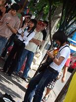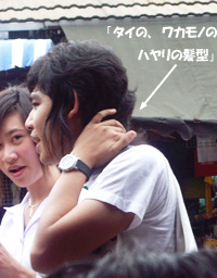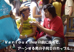 | 2006/7/2 1-2 今日は、Various shop に行く予定です。 朝から打ち合わせしつつ、準備しつつバタバタです。 出発前に、ホテルのパソコンでメールチェックをしました。 お客様からご連絡があったので、返事をしましたら 送信ボタンを押す度に、エラー表示です。 三度も続いて、ゲッソリ。 4度目で、パソコンが起動しなくなりました。 フロントに言って、復旧作業をしてもらいました。 待たされる時間の、長く感じることといったら・・・。 しかもその間も、きっちりカウントされています。 そのことをクレームしましたら、伝わっていないのか、そういう顔なのか ホテルの担当者は、ニコニコしながら言い訳していました。 待ちぼうけたりして、イライラする時間を過ごして、出かけたのは昼前でした。 バンコックの渋谷?とでもいいましょうか、サイアムスクエアにある 「ソムタムヌエ」というソムタム専門店に行ってみました。 店を探して、ウロウロしていましたら、ものすごい大行列を発見しました。 これに違いないっ☆ と、社長が言うので(人のせい、人のせい( ̄ー ̄)) 先頭を見つけてみましたが、どうも様子が違います。 何でしょう? 小学生くらいの子供と、その父母ばかりです。 子友達は手に、テスト問題のような物を持っています。 こ、これじゃないな。と、戻ってみました。 (~_~;) しばらく行くと、数人の行列を発見しました。今度こそこれでした! 待っている人は、若い人達で楽しそうに時間をつぶしています。 気温は30度くらい。 並んでまで〜・・・ (-_-;) と、さっさと諦めて、近所にあったチキンのお店に入りました。 隣のテーブルに、母親と子連れグループが3組座りました。 兄弟、姉妹、中にはまだ赤ちゃんもいました。 そしてその赤ちゃんには、子守の子供がいました。 社長は、その子守がずっと何も食べず飲まずで、気の毒がって、今にも何か出しそうです。 同じ年頃の子守なのに、かたや塾帰りにコーラを飲んで、チキンを食べる。 かたや飲まず食わず、ぐずる赤ちゃんの子守・・・。 社長も私も、心の中では、がんばってね!アンタの方が将来絶対有望よ! と思いました。 (ホンマかいな!って? (^^ゞ ) Various shop に向かいました。 やっと。 ユイは、お休みでした。 「時々日本からえむずのサイトをコピーして、これを売ってくれ〜〜! という人が来るよ〜」 等と、面白い情報も教えてくれます。 日本で代理店をやってよ! というので、そうすることになりました。(笑) 帰り際にメイにオヤツを奨められて、ガツガツ食べてしまいました。 野菜をでんぷん質でくるんで、蒸した感じのオヤツに、少し甘みのある黒酢と 辛いスパイスがかかっていました。美味しいんです。 いつも気になるものを食べているなぁ〜。 と、スリムなメイの食生活を覗き見せてもらいました。 毎回食べることで、ごめんなさい。(鈴) |
