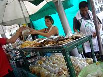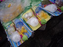 | 2006/7/1 地下鉄とモノレールを乗り継いで、ウィークエンドマーケットに向かいました。 Various shop に向かっていると・・・、メイとユイの友達のゴブちゃんが出てきてくれました。 ワイワイ騒いでいますと、Various shop のスタッフの一人、パティも気づいて出てきてくれました。 パティから、何か飲む?食べる?いろいろ聞かれて、「うん!うん!」のどが渇いていたので 飲み物が出てくるまで、随分待った気がしました。 買ってきてくれたカフェで売っていたという、焼きたてのパイも、社長と奪い合いながら 食べましたっ。 二人とも二度目の朝食です。関取みたい。 メイに再会しました。 相変わらず、ボーイッシュな感じのする美しい女性です。 社長は日本製の電動眉毛そりを、買ってきてほしいと頼まれていたそうで それを渡していました。 メイの眉毛は刺青なのに、なぜでしょう? ま、いいや。 (^_^;) 二時ごろ、遅めのランチをVarious shopの皆と、食べました。 市場の中の食堂でした。 メイ達に食事に連れて行ってもらうと、どれも美味しくて、あ〜こんな料理もあるの!? なんていう発見もあったり、嬉しいです。 ソムタムが出てきました。 わーーーい! ヽ(^o^)丿 ・・・あれ?? え?カニ入りっ! ( ̄○ ̄;)! お皿をよぉ〜〜く見てみると、カニさんの足がちぎれて、内臓もドバー と出て・・・ ソムタムはテーブルの上に、2皿あるのですが、どれにも生のカニが入っています。 皆が平気なら、大丈夫さぁ〜・・・と、ビビリながらも、食い意地が勝ってしまい 食べてしまいました〜〜。 社長も私も、いまだに身体は、どうも無いです。 (^^ゞ 皆と別れて、ウィークエンドマーケットの不快指数の高い方へ・・・と、向かいました。 そうです!遊びに来ているのではありませんっ。 仕入れだ!鈴木君っ! たてぇーーーっ! と、社長がキィキィ言っていました。 行くんですかぁ〜〜? くそ暑いのにぃ〜 (-"-) タイへ来て、ずぅーっと雨に降られています。 今日も、夕方には土砂降りでした。 娘に土産でも買っておこうと、子供服屋を見つけては、アレコレ見るのですが 気に入ったものが無くて、ただ疲れて休憩することにしました。 バンコックでは、ロティボーイという甘いパンが大ブレイクしています。 それの真似かと思う感じのものを食べました。 それは日本でも見かける、焼きたてメロンパン屋さんみたいでした。 いちご味と、コーヒー味で、コーヒー味の方は、中にバターシロップのようなものが入ってます。 焼きたて感があり、食べていると、それがトロっと出てくるのです。 ハイカロリーですが、美味です。(イチゴの方は、美味しくなかったです) 甘いパンで、小腹が満足した私たちは、ホテルの近所の食堂で夕食を済ませて 至福のときへと向かいました。 あ、足マッサージでございます。(^^ゞ その名も・・・・ .:*:・'゜★゜'・:*:.。.:*:・'゜☆。:'・.:*:・.:*:・' パラダイスっ ☆彡 .:*:・'゜★゜'・:*:.。.:*:・'゜☆。:'・.:*:・.:*:・' |